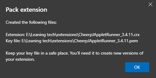 Edge will create two files in the parent directory of your extension: - A .crx file (the packed extension) - A .pem file (the private key, if you didn’t provide one)